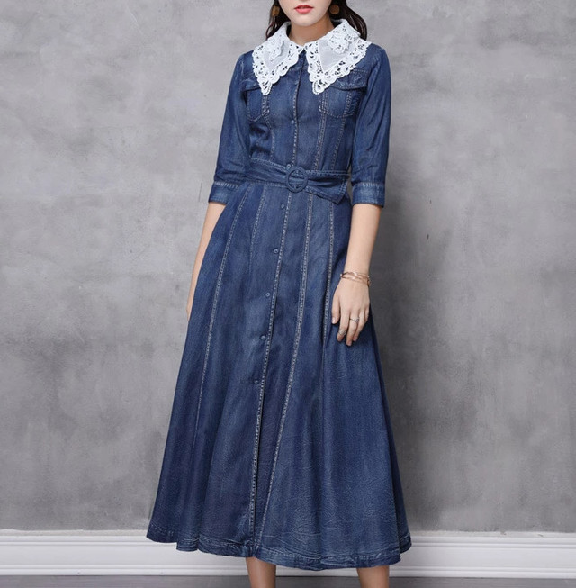 Top Mode ワンピース ロング丈 レース襟 五分袖 ガーリー シンプル クラシカルな雰囲気 エレガント シンプルデザイン シンプル レディース 個性的 おしゃれ シック トレンド クール モダン カジュアル ワイルド モード系 Cool ブルー 青 El 0150 Top Mode